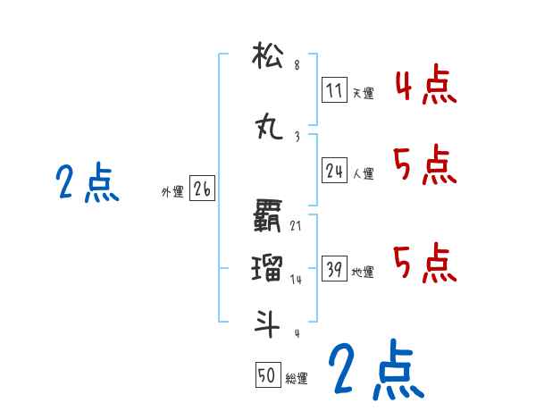 天運![]() | 松丸覇瑠斗さんの天運は11画の4つ星!着実に富や地位を得る幸運な人生。 家系が持つ宿命的な運勢を表します。祖先から受け継いだ苗字ですので自分の力が及びません。家柄を象徴します。 |