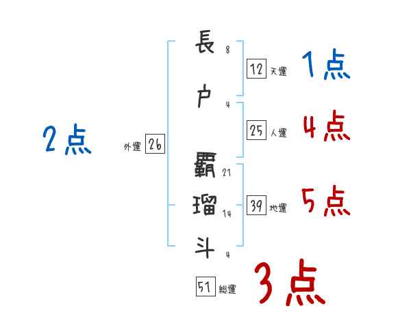 天運![]() | 長戸覇瑠斗さんの天運は12画の1つ星!簡単な失敗で諦めてしまいやすいかも。着実に行動すると良いでしょう。 家系が持つ宿命的な運勢を表します。祖先から受け継いだ苗字ですので自分の力が及びません。家柄を象徴します。 |