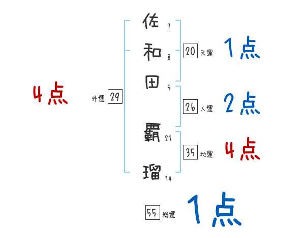 外運![]() | 佐和田覇瑠さんの外運は29画の4つ星!完全主義で才能がある。厳格な心の持ち主。 生活面を象徴する運勢です。外部から受ける影響力を表し、結婚運、家庭運や職場、環境への順応性を表します。 |