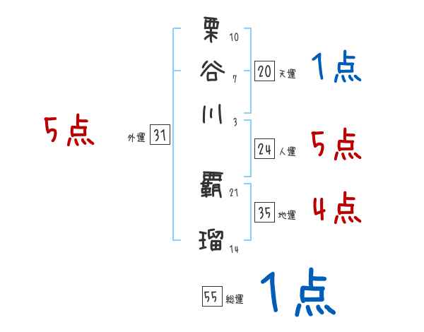 外運![]() | 栗谷川覇瑠さんの外運は31画の5つ星!社交性があり判断力に優れる。順風満帆な人生で円満な生活。 生活面を象徴する運勢です。外部から受ける影響力を表し、結婚運、家庭運や職場、環境への順応性を表します。 |