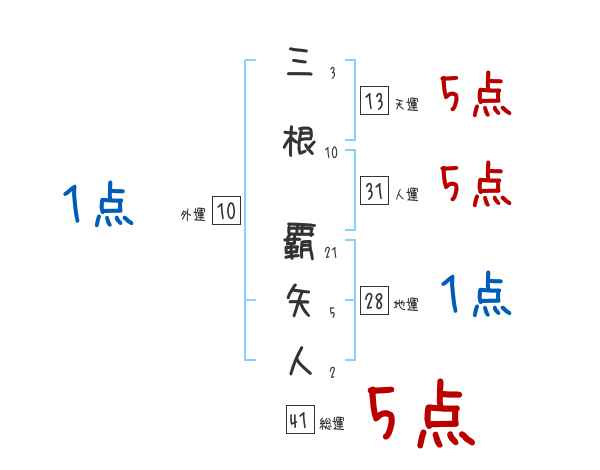 天運![]()  | 三根覇矢人さんの天運は13画の5つ星!才能に恵まれ人気がある。名声を手に入れる。円満な人生。 家系が持つ宿命的な運勢を表します。祖先から受け継いだ苗字ですので自分の力が及びません。家柄を象徴します。 |