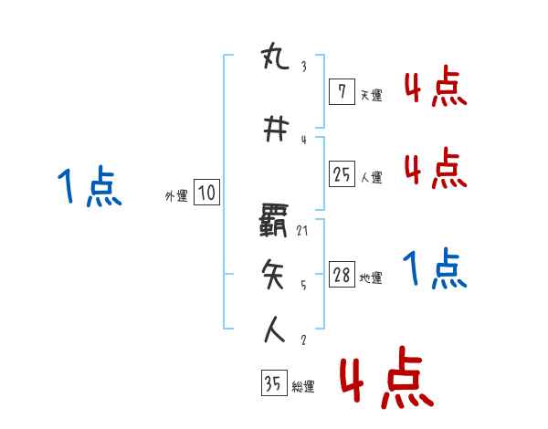 天運![]() | 丸井覇矢人さんの天運は7画の4つ星!強い意志や信念を持ち独立心が強い。自立する。 家系が持つ宿命的な運勢を表します。祖先から受け継いだ苗字ですので自分の力が及びません。家柄を象徴します。 |