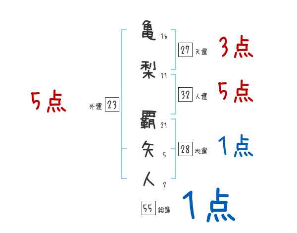 人運![]() | 亀梨覇矢人さんの人運は32画の5つ星!柔軟性があり成功する。チャンスが多く金運が良い。 性格や才能などを表す2番目に重要な運勢です。人間関係や協調性、社会的な成功に影響します。主に20歳から50歳ぐらいまでの中年期の運勢を表します。 |