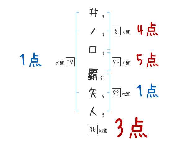 人運![]() | 井ノ口覇矢人さんの人運は24画の5つ星!家庭運が良く順調な人生。金運にも恵まれる。 性格や才能などを表す2番目に重要な運勢です。人間関係や協調性、社会的な成功に影響します。主に20歳から50歳ぐらいまでの中年期の運勢を表します。 |