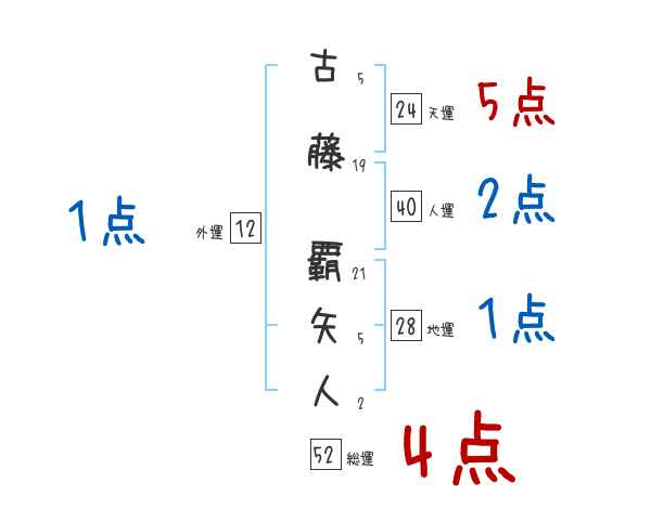 天運![]()  | 古藤覇矢人さんの天運は24画の5つ星!家庭運が良く順調な人生。金運にも恵まれる。 家系が持つ宿命的な運勢を表します。祖先から受け継いだ苗字ですので自分の力が及びません。家柄を象徴します。 |