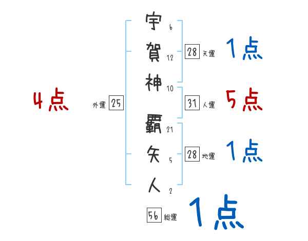 天運![]() | 宇賀神覇矢人さんの天運は28画の1つ星!家庭環境に注意。スポーツで活躍できる能力があるかも。 家系が持つ宿命的な運勢を表します。祖先から受け継いだ苗字ですので自分の力が及びません。家柄を象徴します。 |