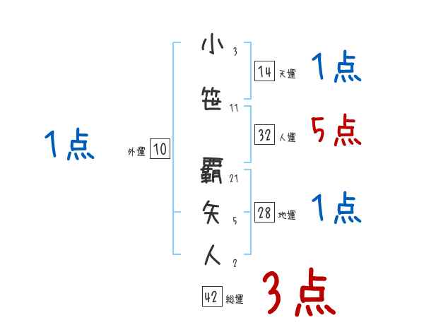 人運![]() | 小笹覇矢人さんの人運は32画の5つ星!柔軟性があり成功する。チャンスが多く金運が良い。 性格や才能などを表す2番目に重要な運勢です。人間関係や協調性、社会的な成功に影響します。主に20歳から50歳ぐらいまでの中年期の運勢を表します。 |