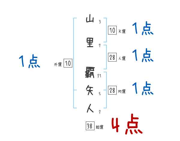 天運![]() | 山里覇矢人さんの天運は10画の1つ星!不安を感じやすい傾向。ストレスを抱えないように注意しましょう。 家系が持つ宿命的な運勢を表します。祖先から受け継いだ苗字ですので自分の力が及びません。家柄を象徴します。 |