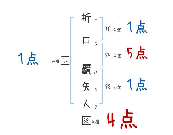 人運![]()  | 折口覇矢人さんの人運は24画の5つ星!家庭運が良く順調な人生。金運にも恵まれる。 性格や才能などを表す2番目に重要な運勢です。人間関係や協調性、社会的な成功に影響します。主に20歳から50歳ぐらいまでの中年期の運勢を表します。 |