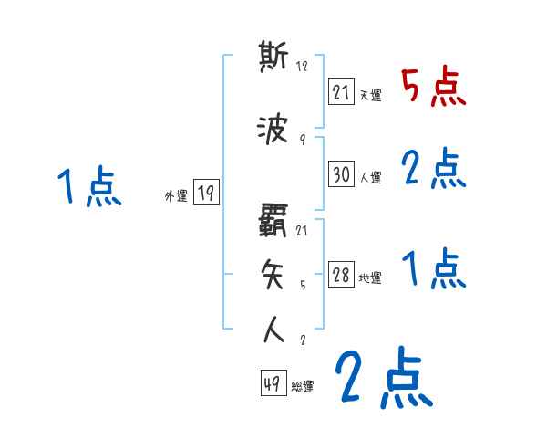 地運![]() | 斯波覇矢人さんの地運は28画の1つ星!家庭環境に注意。スポーツで活躍できる能力があるかも。 個性を表す基礎的な運勢です。性格形成や対人関係、行動力など家庭環境に影響されます。主に誕生してから20歳くらいまでの若年期の運勢を表します。 |