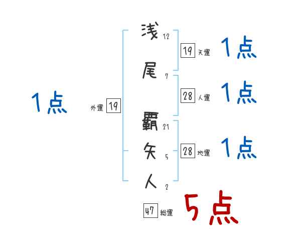 | 天運  | 浅尾覇矢人さんの天運は19画の1つ星!優れた才能を持ちますが、協調性が足りないことも。周りの人と協力する事を意識しましょう。家系が持つ宿命的な運勢を表します。祖先から受け継いだ苗字ですので自分の力が及びません。家柄を象徴します。 |