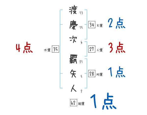 外運![]() | 渡慶次覇矢人さんの外運は35画の4つ星!温厚な性格で感受性が高い。穏和な性格で人望が厚い。 生活面を象徴する運勢です。外部から受ける影響力を表し、結婚運、家庭運や職場、環境への順応性を表します。 |