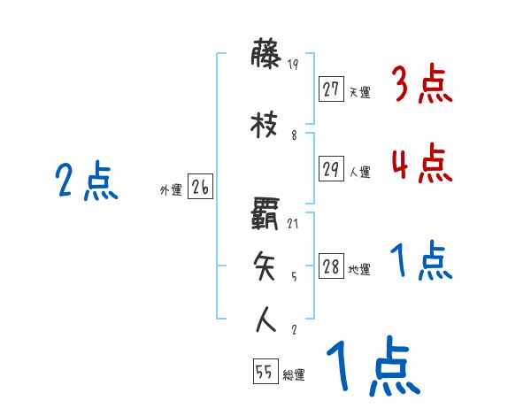 外運![]() | 藤枝覇矢人さんの外運は26画の2つ星!波瀾万丈かも。信頼できる人を大事にしましょう。 生活面を象徴する運勢です。外部から受ける影響力を表し、結婚運、家庭運や職場、環境への順応性を表します。 |