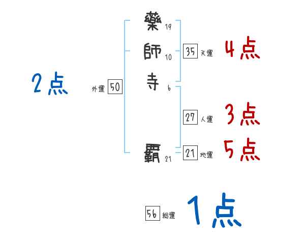 外運![]() | 藥師寺覇さんの外運は50画の2つ星!浮き沈みが激しく不安定。しりすぼみに衰退しやすいので注意しましょう。 生活面を象徴する運勢です。外部から受ける影響力を表し、結婚運、家庭運や職場、環境への順応性を表します。 |