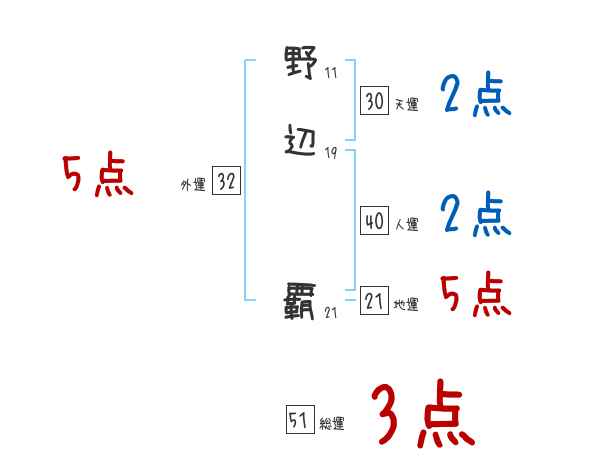 天運![]() | 野辺覇さんの天運は30画の2つ星!浮き沈みの激しさに注意しましょう。 家系が持つ宿命的な運勢を表します。祖先から受け継いだ苗字ですので自分の力が及びません。家柄を象徴します。 |