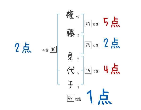 | 人運  | 権藤見代子さんの人運は26画の2つ星!波瀾万丈かも。信頼できる人を大事にしましょう。性格や才能などを表す2番目に重要な運勢です。人間関係や協調性、社会的な成功に影響します。主に20歳から50歳ぐらいまでの中年期の運勢を表します。 |