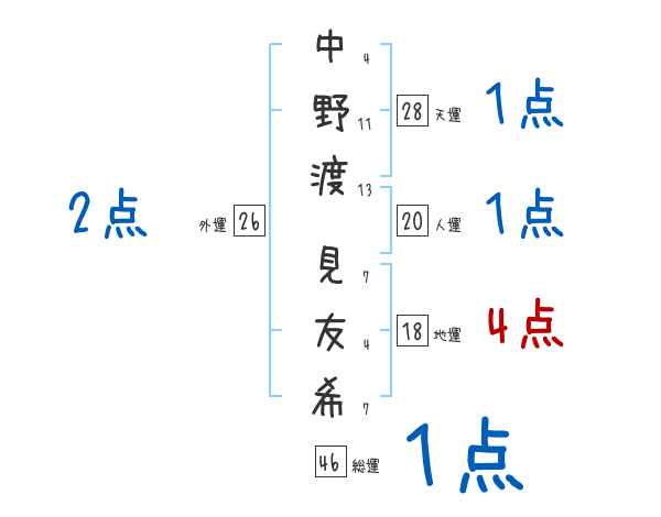 天運![]() | 中野渡見友希さんの天運は28画の1つ星!家庭環境に注意。スポーツで活躍できる能力があるかも。 家系が持つ宿命的な運勢を表します。祖先から受け継いだ苗字ですので自分の力が及びません。家柄を象徴します。 |