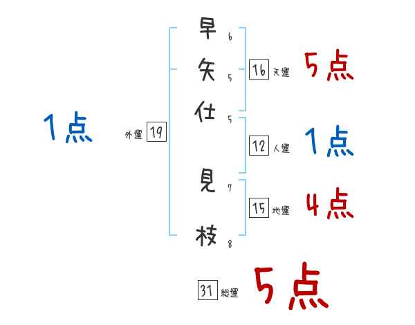 天運![]() | 早矢仕見枝さんの天運は16画の5つ星!人望が厚く大きく発展する。逆転成功が見える。 家系が持つ宿命的な運勢を表します。祖先から受け継いだ苗字ですので自分の力が及びません。家柄を象徴します。 |