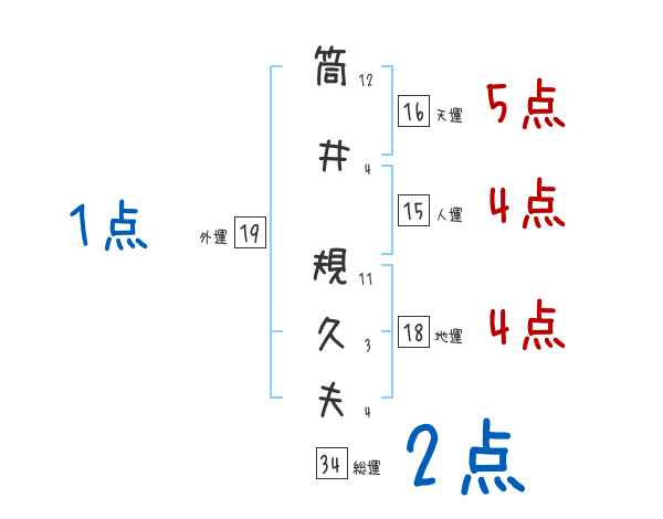 天運![]() | 筒井規久夫さんの天運は16画の5つ星!人望が厚く大きく発展する。逆転成功が見える。 家系が持つ宿命的な運勢を表します。祖先から受け継いだ苗字ですので自分の力が及びません。家柄を象徴します。 |