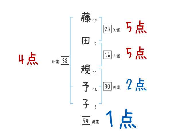 天運![]() | 藤田規予子さんの天運は24画の5つ星!家庭運が良く順調な人生。金運にも恵まれる。 家系が持つ宿命的な運勢を表します。祖先から受け継いだ苗字ですので自分の力が及びません。家柄を象徴します。 |