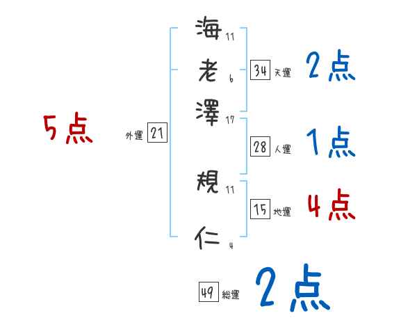 外運![]() | 海老澤規仁さんの外運は21画の5つ星!統率力がある。独立し成功する。名誉を手に入れる。 生活面を象徴する運勢です。外部から受ける影響力を表し、結婚運、家庭運や職場、環境への順応性を表します。 |