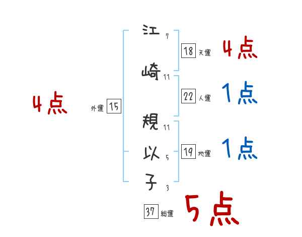 天運![]() | 江崎規以子さんの天運は18画の4つ星!情熱的で剛気。忍耐力があり信頼される。 家系が持つ宿命的な運勢を表します。祖先から受け継いだ苗字ですので自分の力が及びません。家柄を象徴します。 |