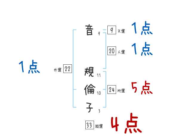 天運![]() | 音規倫子さんの天運は9画の1つ星!消極的で才能を発揮することが苦手なことも。周りの意見に耳を傾けましょう。 家系が持つ宿命的な運勢を表します。祖先から受け継いだ苗字ですので自分の力が及びません。家柄を象徴します。 |