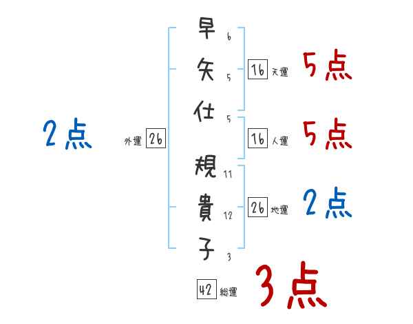 人運![]() | 早矢仕規貴子さんの人運は16画の5つ星!人望が厚く大きく発展する。逆転成功が見える。 性格や才能などを表す2番目に重要な運勢です。人間関係や協調性、社会的な成功に影響します。主に20歳から50歳ぐらいまでの中年期の運勢を表します。 |