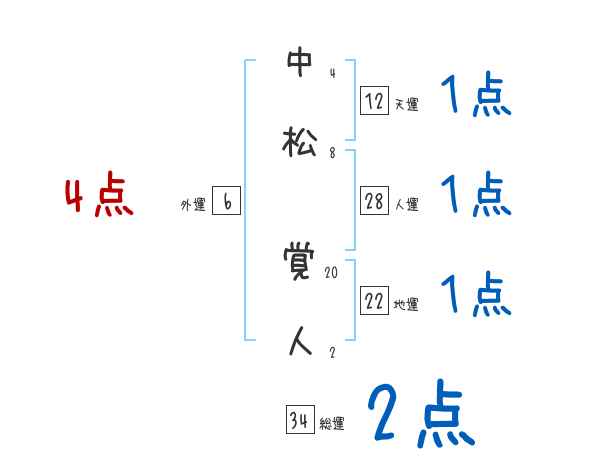総運![]() | 中松覚人さんの総運は34画の2つ星!独創性に優れるが、自尊心が強く災難に注意しましょう。 あなたの人生を表す1番重要な運勢です。生涯を通じて影響する総合運となり、主に50歳以降の晩年期に影響を及ぼします。 |