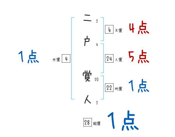 天運![]() | 二戸覚人さんの天運は6画の4つ星!慎重な努力家で信頼を得る。誠実な精神で向上心に優れる。 家系が持つ宿命的な運勢を表します。祖先から受け継いだ苗字ですので自分の力が及びません。家柄を象徴します。 |