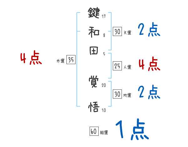 外運![]() | 鍵和田覚悟さんの外運は35画の4つ星!温厚な性格で感受性が高い。穏和な性格で人望が厚い。 生活面を象徴する運勢です。外部から受ける影響力を表し、結婚運、家庭運や職場、環境への順応性を表します。 |