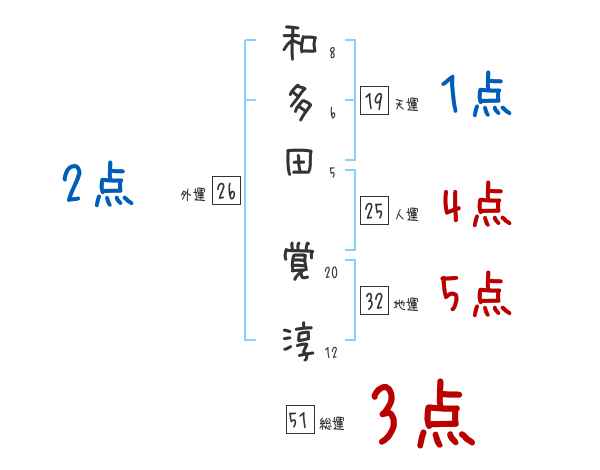 外運![]() | 和多田覚淳さんの外運は26画の2つ星!波瀾万丈かも。信頼できる人を大事にしましょう。 生活面を象徴する運勢です。外部から受ける影響力を表し、結婚運、家庭運や職場、環境への順応性を表します。 |