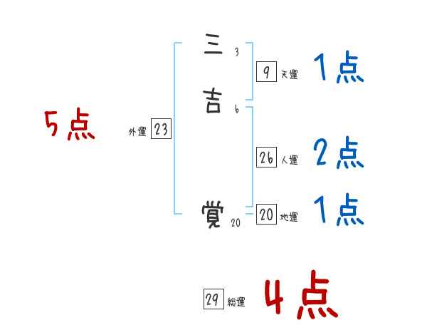 天運![]() | 三吉覚さんの天運は9画の1つ星!消極的で才能を発揮することが苦手なことも。周りの意見に耳を傾けましょう。 家系が持つ宿命的な運勢を表します。祖先から受け継いだ苗字ですので自分の力が及びません。家柄を象徴します。 |