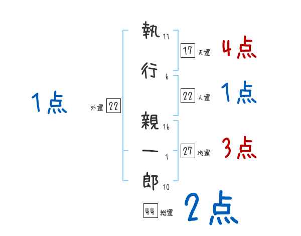 人運![]() | 執行親一郎さんの人運は22画の1つ星!努力することが苦手ないっぽう手先が器用。芸術性にも優れる。 性格や才能などを表す2番目に重要な運勢です。人間関係や協調性、社会的な成功に影響します。主に20歳から50歳ぐらいまでの中年期の運勢を表します。 |