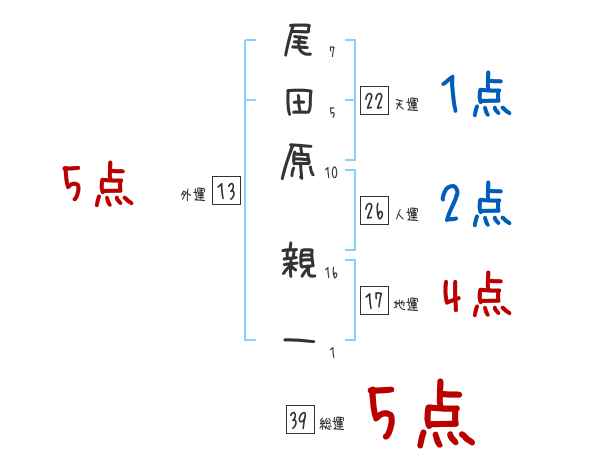 総運![]() | 尾田原親一さんの総運は39画の5つ星!社交性に優れ人望が厚い。人の上に立ち成功する。 あなたの人生を表す1番重要な運勢です。生涯を通じて影響する総合運となり、主に50歳以降の晩年期に影響を及ぼします。 |