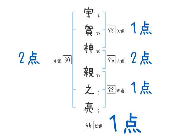 天運![]() | 宇賀神親之亮さんの天運は28画の1つ星!家庭環境に注意。スポーツで活躍できる能力があるかも。 家系が持つ宿命的な運勢を表します。祖先から受け継いだ苗字ですので自分の力が及びません。家柄を象徴します。 |