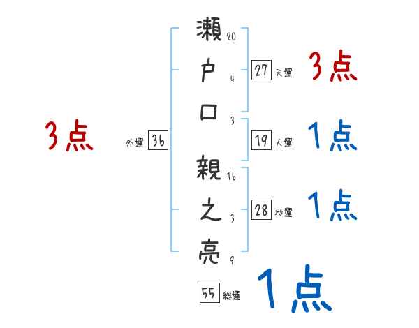 天運![]() | 瀬戸口親之亮さんの天運は27画の3つ星!頭脳明晰だが強情で摩擦が多い傾向。孤立に注意。 家系が持つ宿命的な運勢を表します。祖先から受け継いだ苗字ですので自分の力が及びません。家柄を象徴します。 |