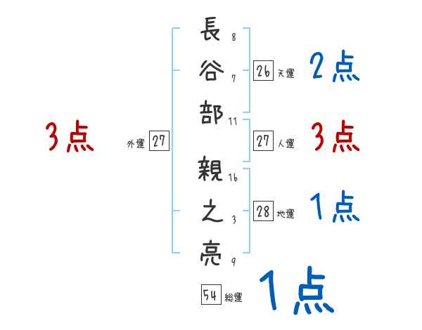 総運![]() | 長谷部親之亮さんの総運は54画の1つ星!トラブルが多いかも。周りをよく見て協調して過ごしましょう。 あなたの人生を表す1番重要な運勢です。生涯を通じて影響する総合運となり、主に50歳以降の晩年期に影響を及ぼします。 |