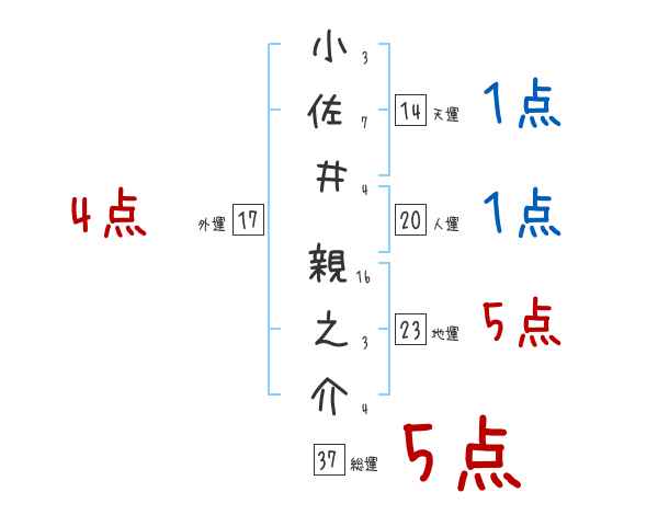 外運![]() | 小佐井親之介さんの外運は17画の4つ星!積極的な行動力。地位を気づき財産を手に入れる。純粋な心と直感力。 生活面を象徴する運勢です。外部から受ける影響力を表し、結婚運、家庭運や職場、環境への順応性を表します。 |