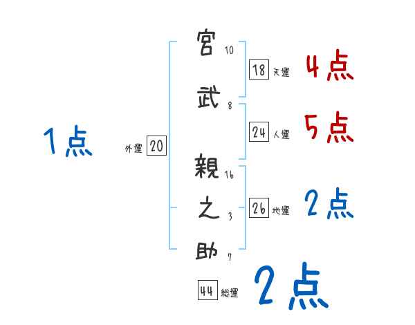 天運![]() | 宮武親之助さんの天運は18画の4つ星!情熱的で剛気。忍耐力があり信頼される。 家系が持つ宿命的な運勢を表します。祖先から受け継いだ苗字ですので自分の力が及びません。家柄を象徴します。 |