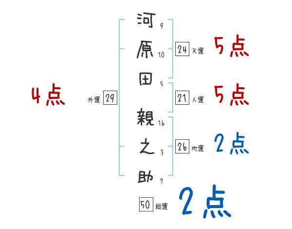 外運![]() | 河原田親之助さんの外運は29画の4つ星!完全主義で才能がある。厳格な心の持ち主。 生活面を象徴する運勢です。外部から受ける影響力を表し、結婚運、家庭運や職場、環境への順応性を表します。 |
