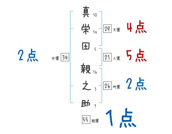 人運![]() | 真栄田親之助さんの人運は21画の5つ星!統率力がある。独立し成功する。名誉を手に入れる。 性格や才能などを表す2番目に重要な運勢です。人間関係や協調性、社会的な成功に影響します。主に20歳から50歳ぐらいまでの中年期の運勢を表します。 |