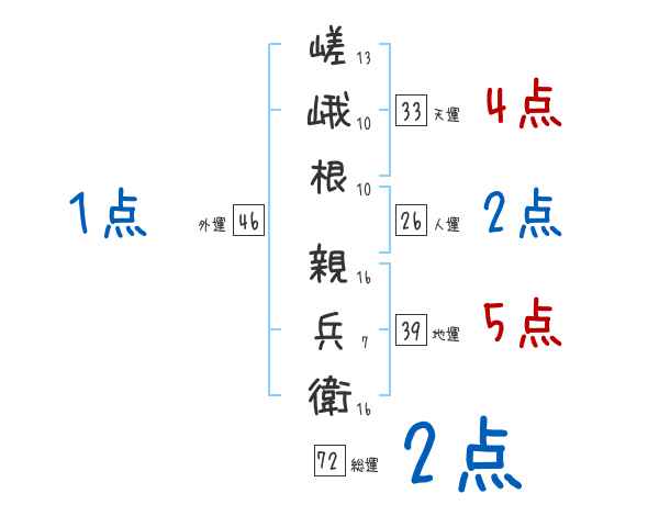 地運![]() | 嵯峨根親兵衛さんの地運は39画の5つ星!社交性に優れ人望が厚い。人の上に立ち成功する。 個性を表す基礎的な運勢です。性格形成や対人関係、行動力など家庭環境に影響されます。主に誕生してから20歳くらいまでの若年期の運勢を表します。 |
