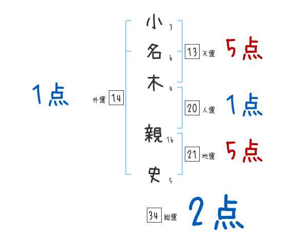 総運![]() | 小名木親史さんの総運は34画の2つ星!独創性に優れるが、自尊心が強く災難に注意しましょう。 あなたの人生を表す1番重要な運勢です。生涯を通じて影響する総合運となり、主に50歳以降の晩年期に影響を及ぼします。 |