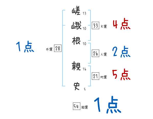 天運![]() | 嵯峨根親史さんの天運は33画の4つ星!権力志向でプライドが高い。勇気があり運を切り開き成功する。 家系が持つ宿命的な運勢を表します。祖先から受け継いだ苗字ですので自分の力が及びません。家柄を象徴します。 |
