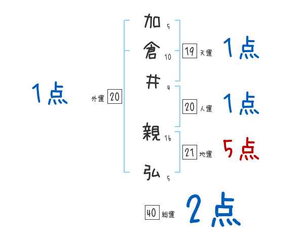 地運![]() | 加倉井親弘さんの地運は21画の5つ星!統率力がある。独立し成功する。名誉を手に入れる。 個性を表す基礎的な運勢です。性格形成や対人関係、行動力など家庭環境に影響されます。主に誕生してから20歳くらいまでの若年期の運勢を表します。 |