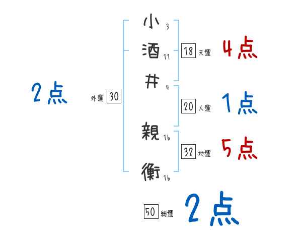 外運![]() | 小酒井親衡さんの外運は30画の2つ星!浮き沈みの激しさに注意しましょう。 生活面を象徴する運勢です。外部から受ける影響力を表し、結婚運、家庭運や職場、環境への順応性を表します。 |