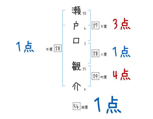 天運![]() | 瀬戸口観介さんの天運は27画の3つ星!頭脳明晰だが強情で摩擦が多い傾向。孤立に注意。 家系が持つ宿命的な運勢を表します。祖先から受け継いだ苗字ですので自分の力が及びません。家柄を象徴します。 |