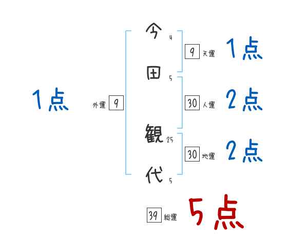 総運![]() | 今田観代さんの総運は39画の5つ星!社交性に優れ人望が厚い。人の上に立ち成功する。 あなたの人生を表す1番重要な運勢です。生涯を通じて影響する総合運となり、主に50歳以降の晩年期に影響を及ぼします。 |