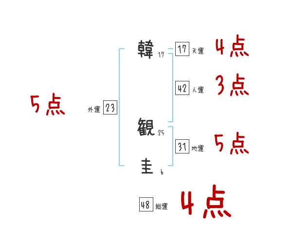 外運![]() | 韓観圭さんの外運は23画の5つ星!想像力に優れ活力がある。一代で成功し名誉を手に入れる。 生活面を象徴する運勢です。外部から受ける影響力を表し、結婚運、家庭運や職場、環境への順応性を表します。 |